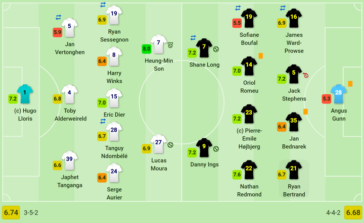 Tanguy Ndombele's shot deflected in off Jack Stephens to give the hosts the lead against the run of play, but Shane Long profited from some poor Hugo Lloris goalkeeping to level before the break.