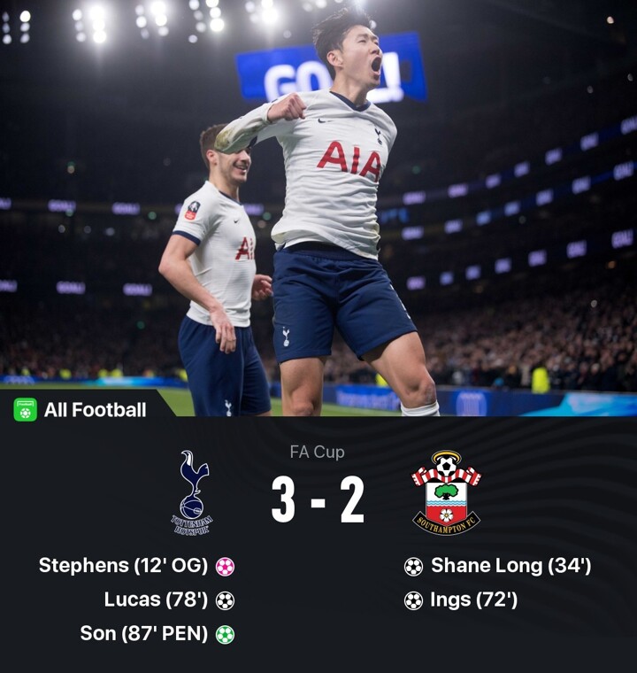 Danny Ings then put Southampton in front 18 minutes from time, only for Lucas Moura to fire in an equaliser and Son to convert from the spot after he was fouled by Angus Gunn, setting up a home tie with Norwich City in the next round.
